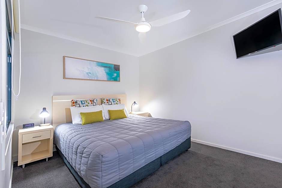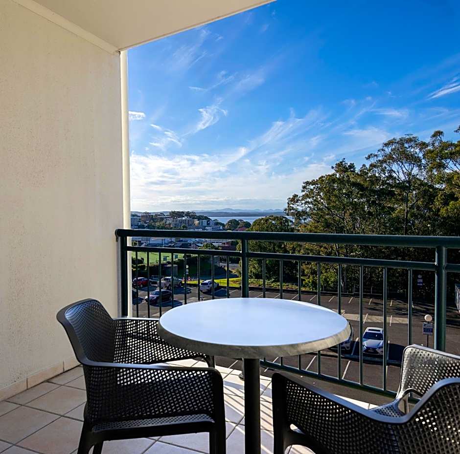This spacious apartment features a private balcony with stunning views of Port Stephens. Offers a kitchenette and a large living area. This apartment is located next to the elevator.